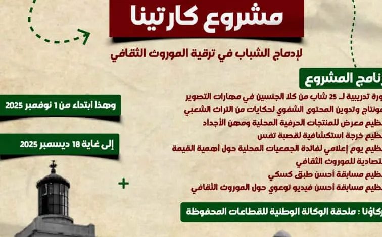 وأضاف ذات المتحدث أن مشروع “كارتينا” الممول من طرف وزارة الثقافة والفنون سيعمل في مرحلته الأولى على تعزيز قدرات 50 شابا في مهارات التصوير و التركيب و الإخراج, من خلال دورة تكوينية لمدة أسبوعين بمقر الملحقة المحلية للقطاع المحفوظ بتنس, لتأهيلهم للمشاركة في تنفيذ المشروع و إنتاج سلسلة من الفيديوهات حول الموروث الثقافي تحت شعار ” ابقى في دارك و تعرف على موروث بلادك”.كما يتضمن هذا المشروع تنظيم عدد من الأنشطة تزامنا و المناسبات الوطنية و التاريخية على غرار اليوم الوطني للحرفي المصادف ل 9 نوفمبر من كل سنة, الذي سيعرف تنظيم معرض للمنتجات الحرفية المحلية و مهن الأجداد, وهذا بغية تمكين المرأة الحرفية من الإندماج في الحركة الإقتصادية و الترويج لمنتجاتها, وذكرى مظاهرات 11 ديسمبر, التي سيتم خلالها تكريم صاحب أحسن فيديو ترويجي للموروث الثقافي, وفقا لنفس المصدر.