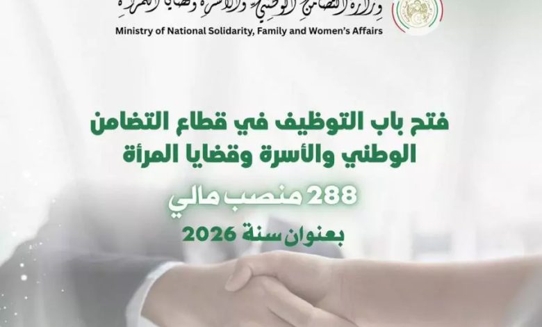 أعلنت وزارة التضامن الوطني والأسرة وقضايا المرأة في بيان لها، عن فتح باب التوظيف على أساس الشهادة لتعزيز الطواقم البيداغوجية والتربوية بالمؤسسات التعليمية المتخصصة، وكذا طواقم المؤسسات المتخصصة في رعاية الفئات المتكفل بها، من خلال مسابقة على أساس الشهادة، حيث 288 منصبا ماليا لسنة 2026.